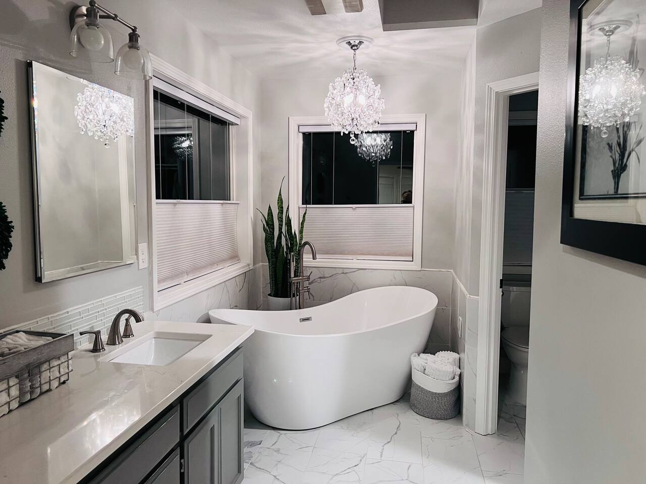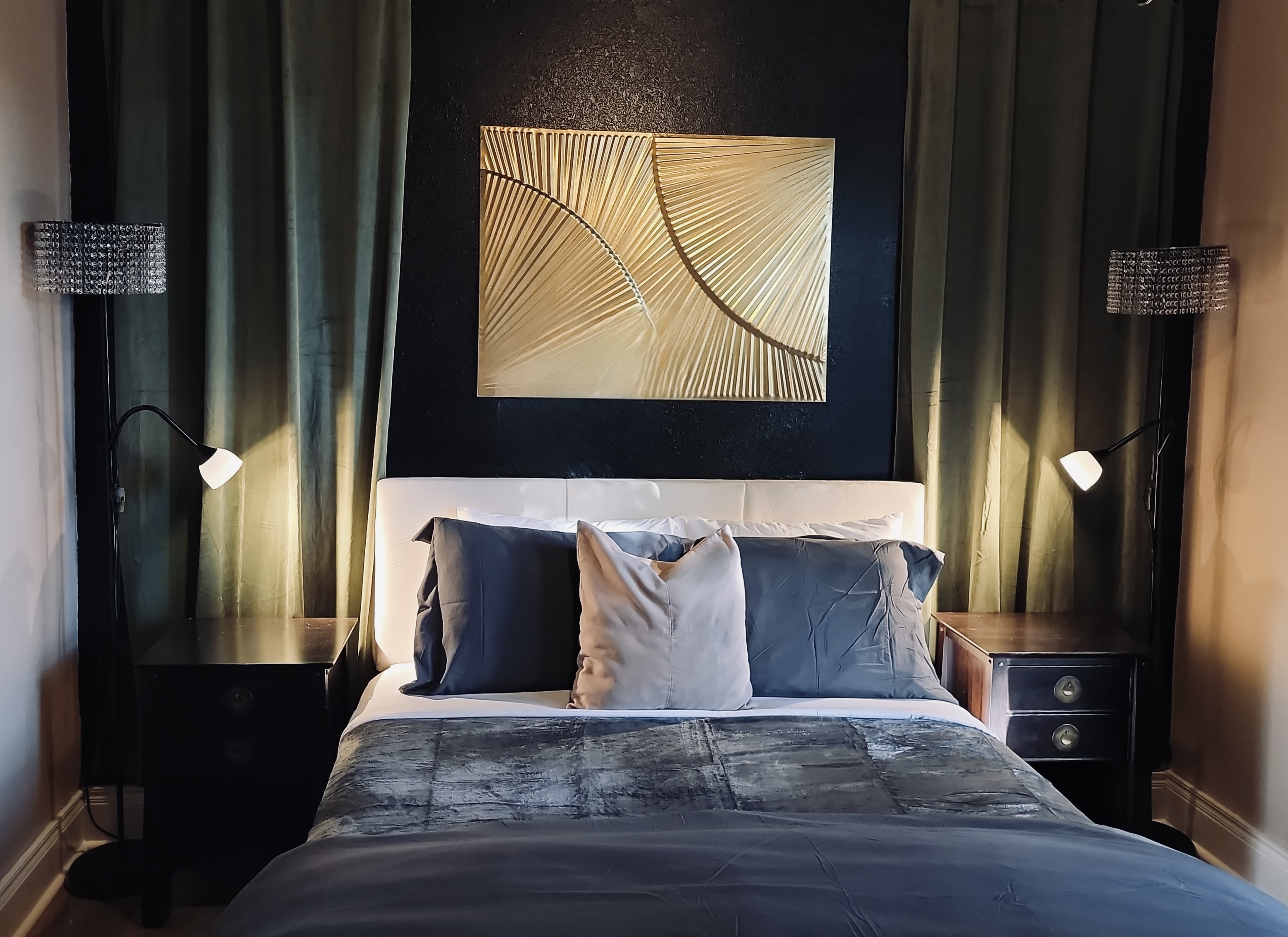The overhead chandeliers bathe you in golden light, as you ready at the vintage vanity. A Bluetooth phonograph plays your favorite tunes, as you lounge on the velvet loveseat, with a gin & tonic in hand. This gorgeous one-bedroom apartment, full of natural light, has a full kitchen, dining space, and a stand up shower. The bed is a comfortable queen memory foam mattress, and there is an adjacent area with a twin daybed and trundle.