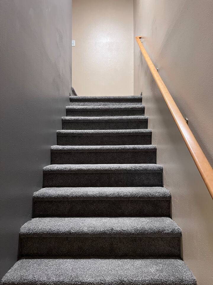 Your bedroom and bathroom are at the top of a set of stairs.