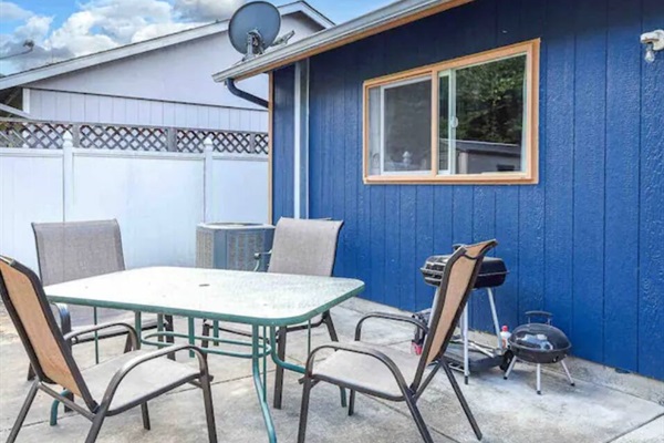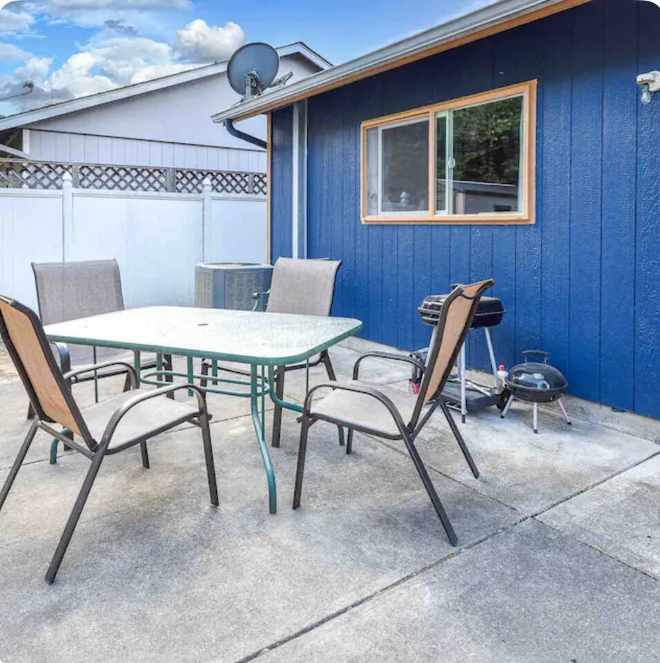 The bottom floor has a large shared kitchen, dining room, living room, bathroom, backyard with outdoor grill, and free laundry, as well as an additional bedroom.