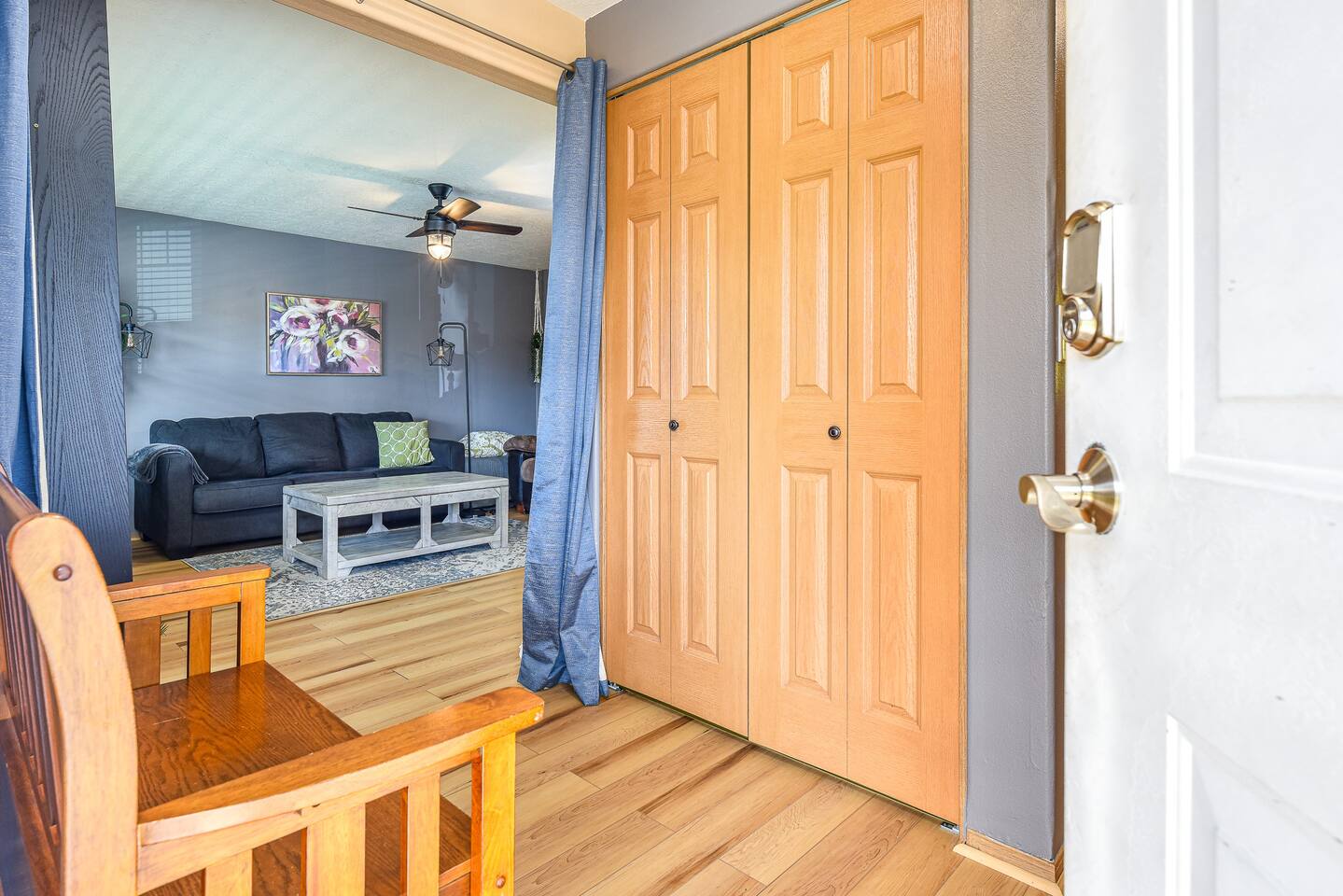 Beyond this bedroom, is a shared free laundry room, large kitchen, dining room, living room, half bathroom, and backyard, shared amongst all guests of the homes.