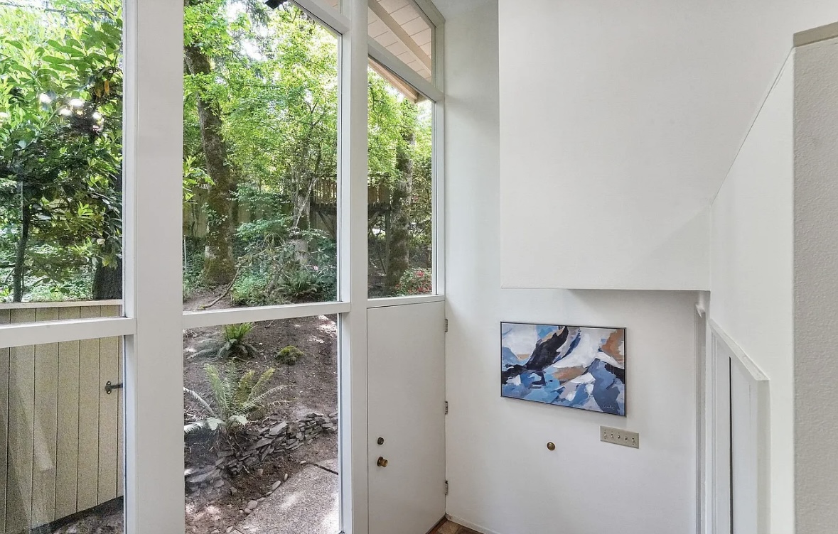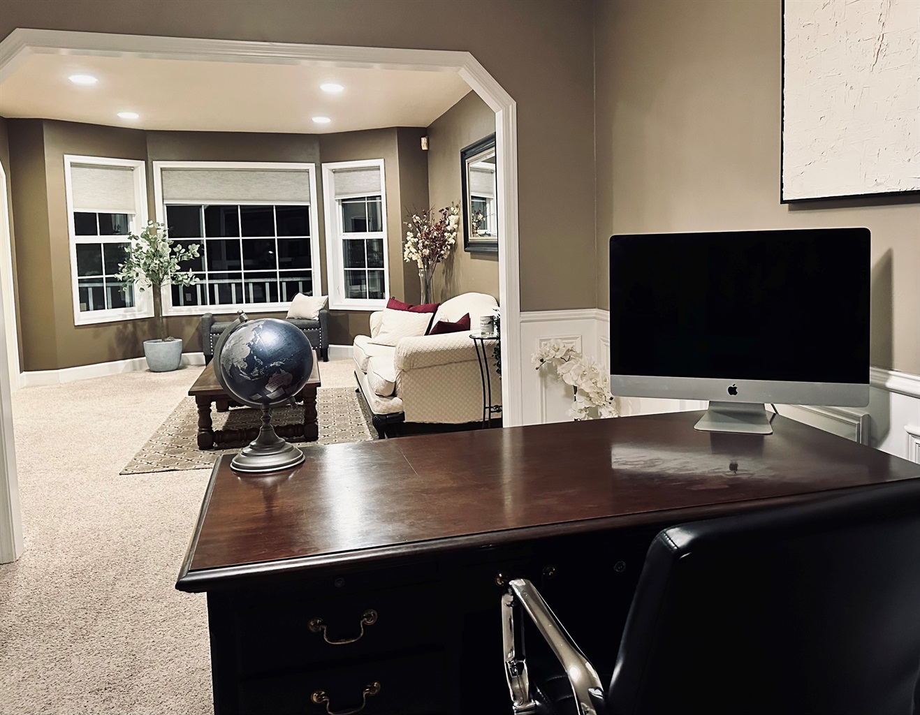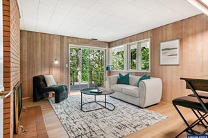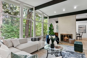 * Formal living room with floor-to-ceiling windows and an electric fireplace
