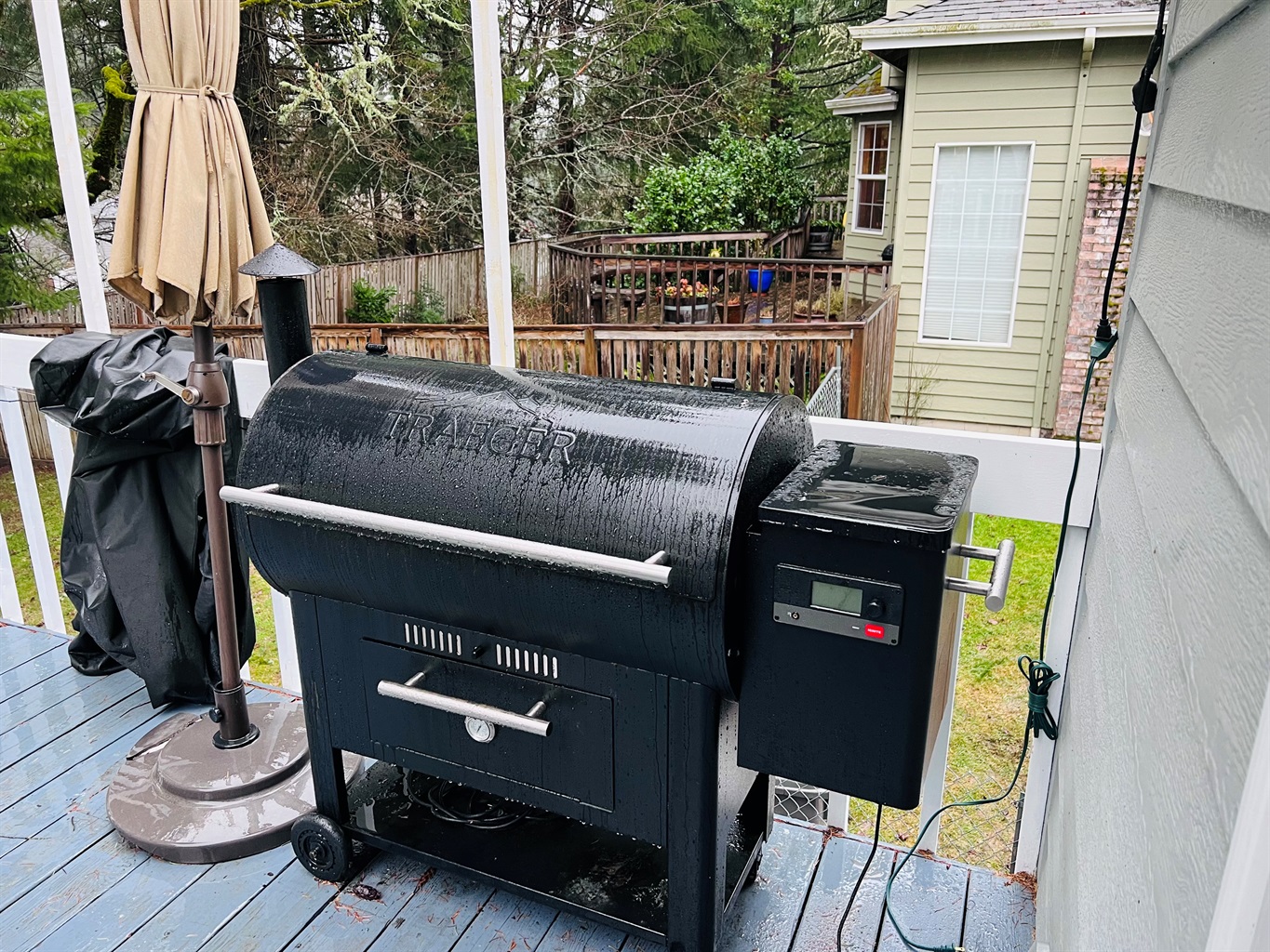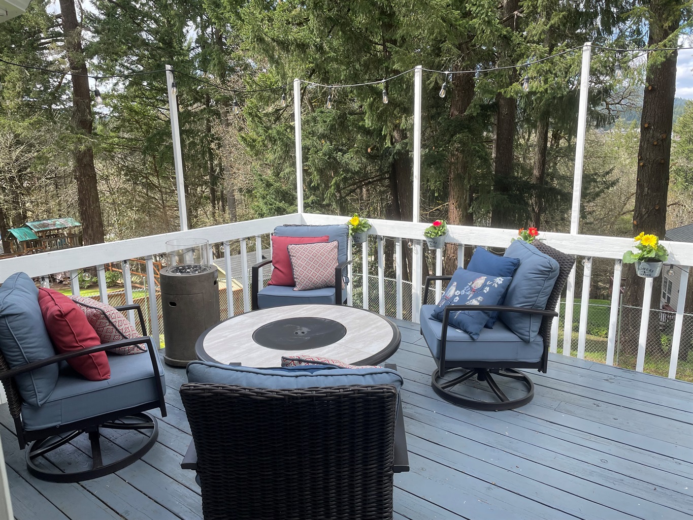 • Outdoor deck with patio seating, a Traeger grill, and a cozy fire pit.