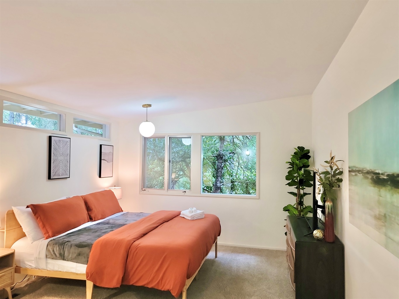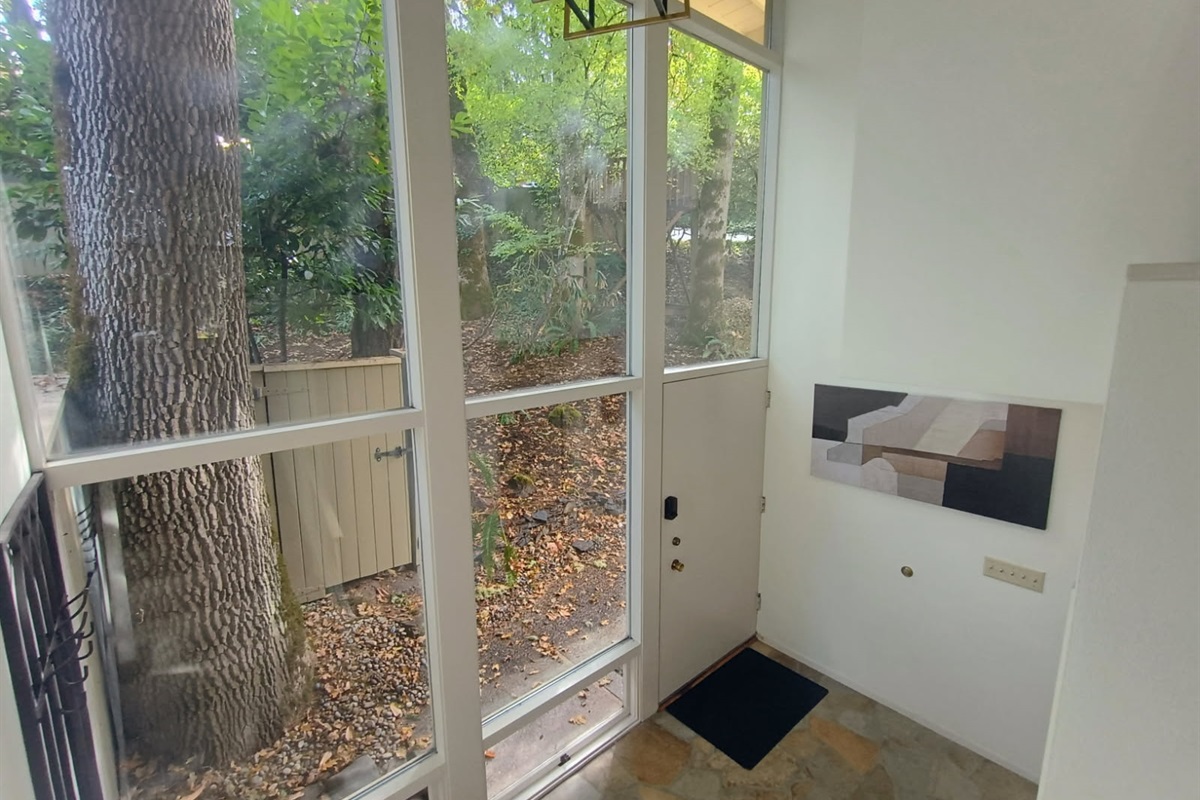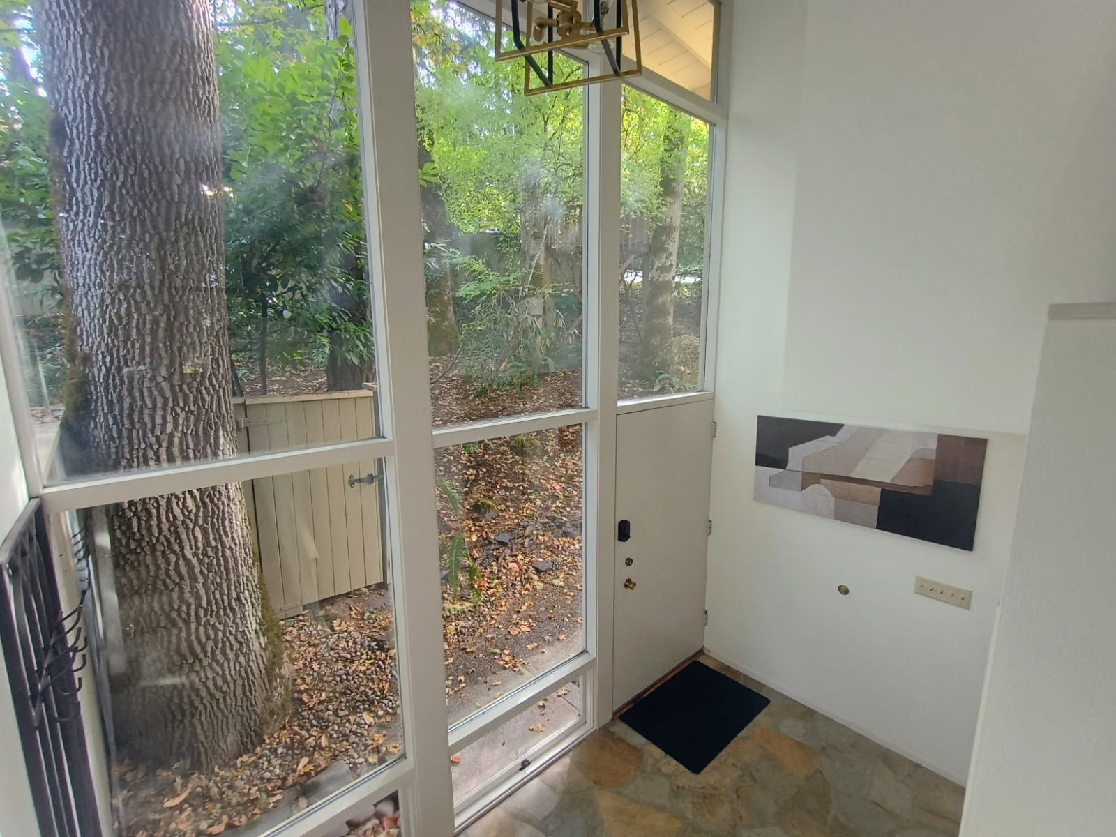 This architecturally significant mid-century home, has giant floor-to-ceiling windows, creating cascading twilights amongst the forested trees.