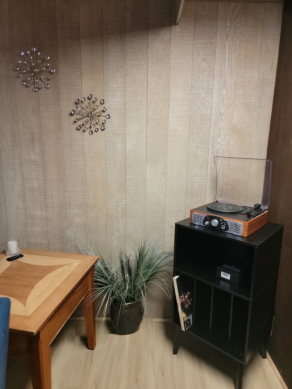 * Game room in the converted garage with air hockey, ping pong, foosball, and a mini fridge