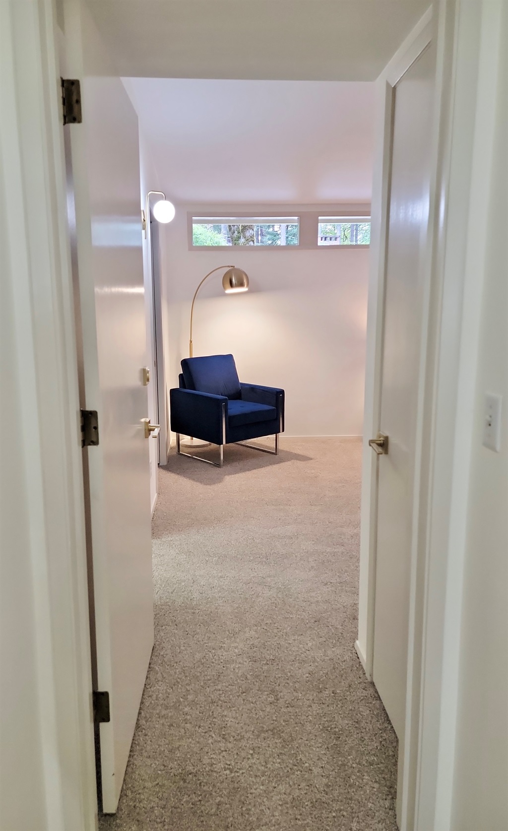 * Formal living room with floor-to-ceiling windows and an electric fireplace