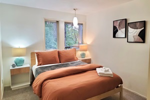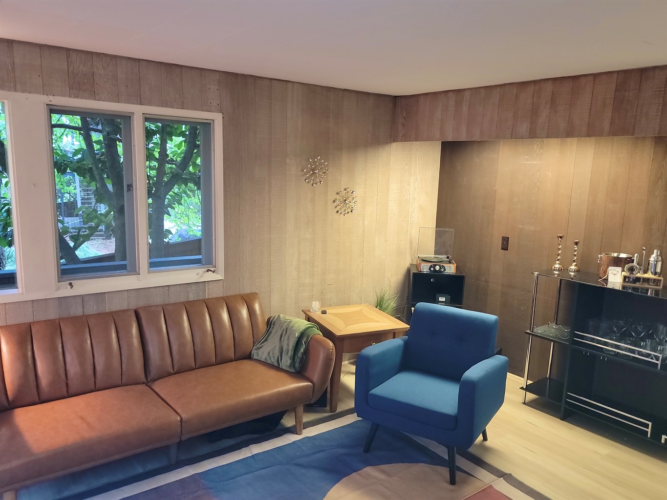 * Den-style living room with a bar, fireplace, and futon fold-out, to sleep two more.